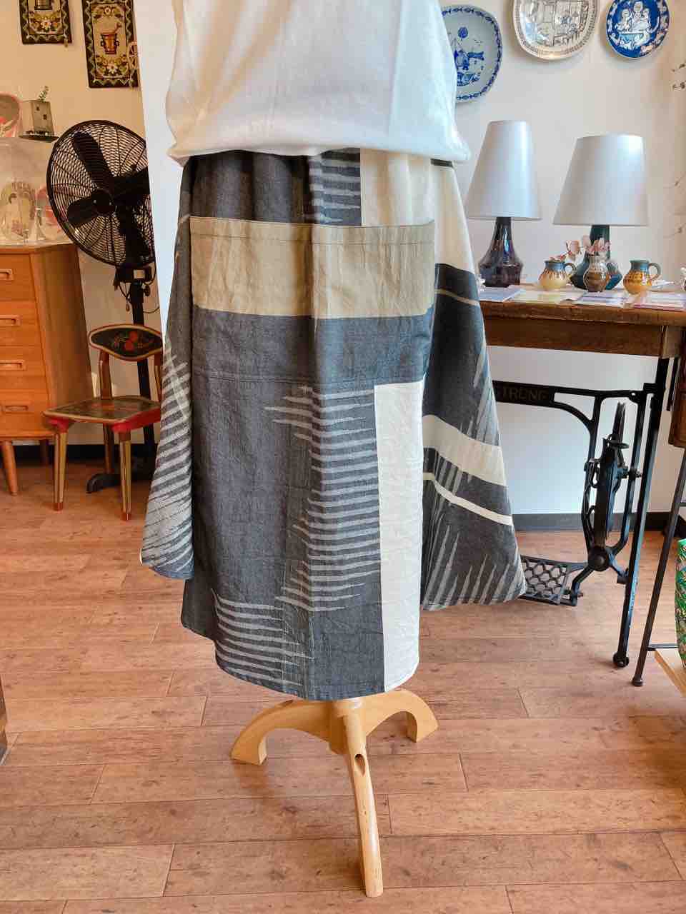 どこが前でも履けるから、スカートをくるくるまわすと全然違うシルエットと柄ができあがり。